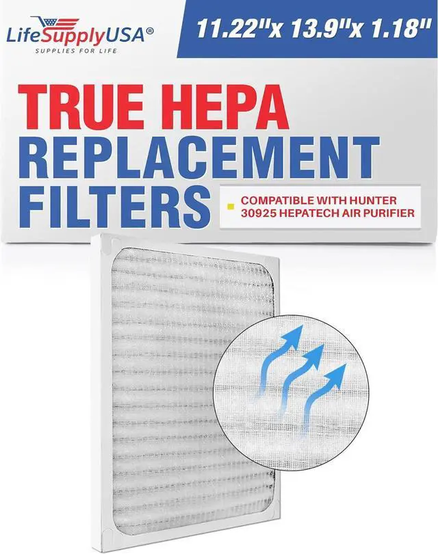 Three-stage filter - Contains a mesh screen particle pre-filter, a submicron primary filter and an activated charcoal filter. Filter 1 removes large dust particles, Filter 2 captures particles as small as .1 microns from the air, Filter 3 absorbs/eliminates odors. Recommended that you replace at least every 6 months with normal use for optimal performance. This is a high quality replacement part by LifeSupplyUSA exclusively for sale by LifeSupplyUSA. This is not an OEM product and is not covered under any OEM warranty. The brand names and logos referenced here are the registered trademarks of their respective owners. Any use of these brand names, models or part number designations for this product is made solely for purposes of demonstrating compatibility. Brand New, Individually Sealed. By LifeSupplyUSA.Replacement Filter fits Hunter 30925 HEPAtech Air Purifiers by LifeSupplyUSA. Aftermarket 30925 HEPAtech Replacement Air Purifier Filter fits Hunter models: 30100, 30110, 30125, 30140, 30150, 30165, 37125.