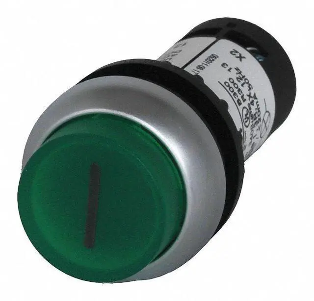 Illuminated Push Button, 22 mm, Momentary, Type of Operator Extended Button, Basic Material Plastic, Polycarbonate Head Material, 1NO Contact Form, Silver Coated Polycarbonate Bezel, Color Green, Lamp Module Voltage 24V AC/DC, Lamp Module Type Full Voltage, Lamp Type LED, Lamp Voltage 24, Contact Rating 1.5A @ 230V AC, 3A @ 24V DC, NEMA Contact Rating Designation AC-15, DC-13, Number of Operators 1, NEMA Rating 1, 12, 13, 3, 4X, IP Rating 67, 69K, Legend I, Legend/Background Color White/Green.