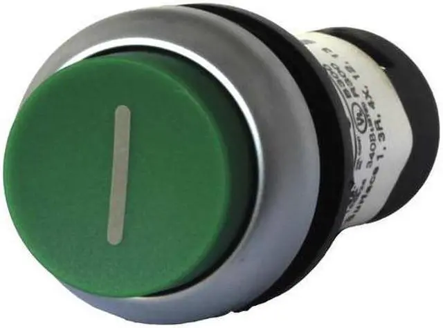 Non-Illuminated Push Button, 22 mm, Maintained (Field Convertible) Action, Extended Button Type of Operator, Head Material Plastic, Contact Form 1NO, Bezel Silver Nylon, Color Green, Contact Rating 1.5A @ 230V AC, 3A @ 24V DC, NEMA Contact Rating Designation AC-15, DC-13, Number of Operators 1, NEMA Rating 1, 12, 13, 3, 4X, IP Rating 67, 69K, Legend I, Legend/Background Color White/Green, Standards CCC, CE, CSA, IEC 60947, Lloyd's Register, RoHS, UL, VDE 0660, Terminal Connection Pressure Plate.
