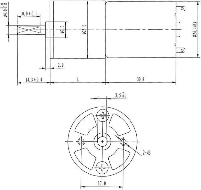 1. Compact DC Gear Box Motor Combination with 25mm diameter gearbox and has 2 terminal connectors.