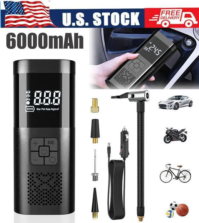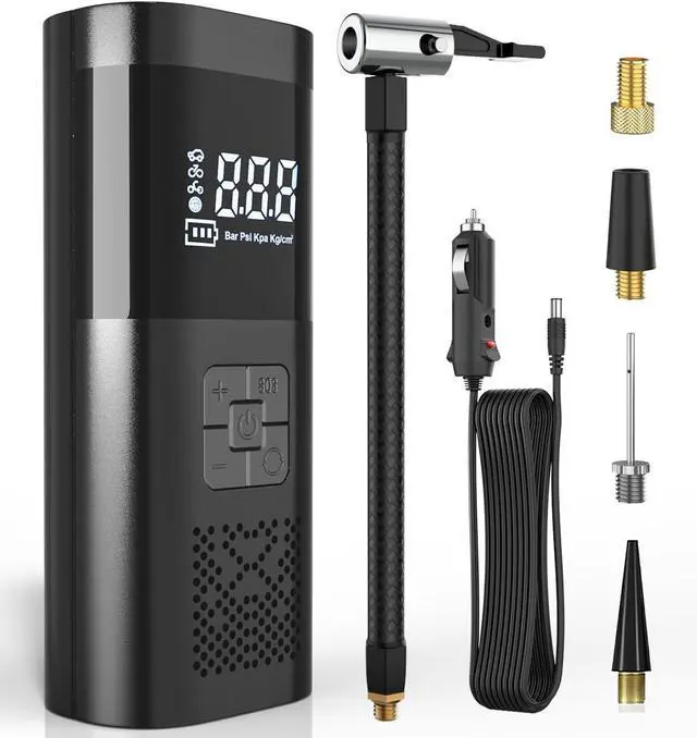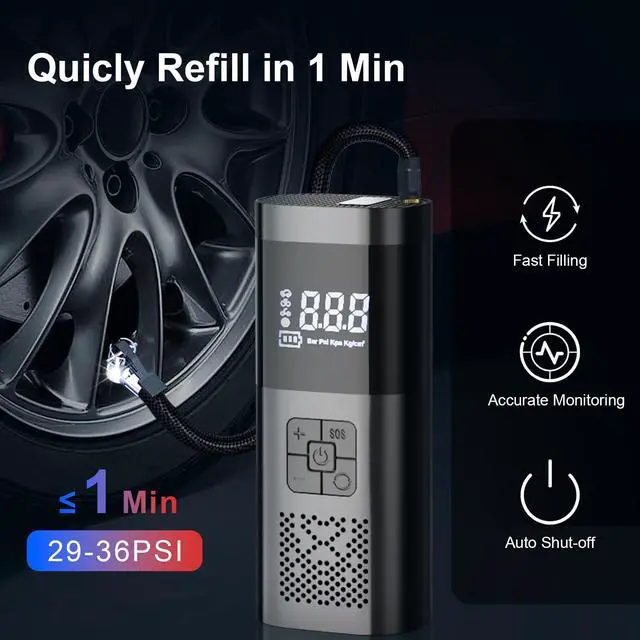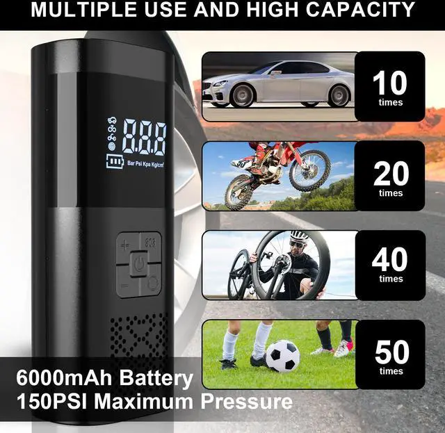 AMAZING INFLATABLE SPEED: Tire inflator portable air compressor has 6X faster inflation, the tire pump provides 15000mAh battery, 150PSI high air pressure can fill 32-36 PIS tires in 45S, up to 35 refills MINI & PORTABLE: The portable tire inflator for car is only 1.7 LB, the size of your hand , whether for work, trip, hiking.it can fit in your pocket, backpack or the trunk of your car,as car pump,bike pump,motorcycle pump, ball pump AUTO TIRE INFLATOR: Air compressor for car can self-test tire pressure and full of self-stopping to ensure safety when reaching the preset pressure, and equipped with a pressure gauge, set the value of the need to replenish the air will automatically replenish the air for you MULTIFUNCTIONAL AIR PUMP: Portable tire inflator has 5 modes for car tire,bike tire, motorcycle tire, ball and inflatable products,switch by one click, it is a must-have traveling car accessories for the elderly and men. Easy to operate and save time, bringing you the convenience of traveling by car EMERGENCY HELPER: Electric air pump equipped with emergency lights, emergency inflatable and emergency rechargeable treasure and other emergency functions, do not need to worry about sudden car breakdown problems, bring comfortable traveling for family, friends and yourself 24-hour SERVICE: If you have any problems, please let us solve for you and give you the fastest speed processing