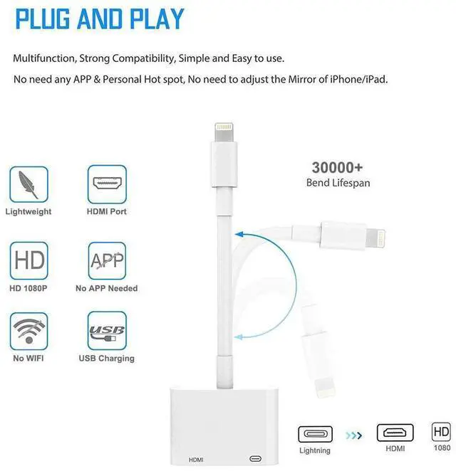 Easy to install: Plug and play, install in 30 seconds, easy to achieve fast and stable connection, automatic mirroring (please note: 5V 1A USB charging cable must be plugged in before use). Small and convenient Adopted lightweight but premium quality aluminum alloy shell, which provides you a long-lasting portable Lightning to HDMI Converter. It has a compact and light weight design, which allows you to carry it in your bag everywhere.