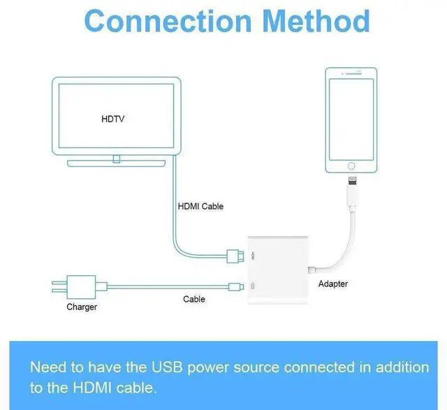 4. Please click the "Trust" and wait 5 seconds to synchronize the iPhone screen with the TV. Please Note Must be connected to power source to function (Strongly recommended 5V/2A) Due to HDCP copyright protection measures, the lighting to HDMI adapter doesnt work with some paid contents including Netflix, Amazon video, DIRECTV, HULU and other App which need to be paid fee.