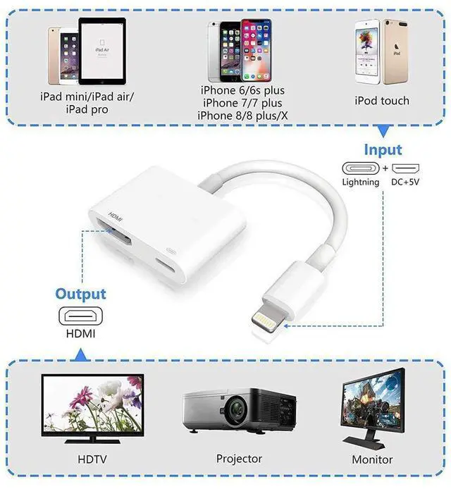 Wide Compatibility: Lightning to HDMI Adapter enable support for multiple devices? phone X, phone 8/ 8 Plus, phone 7/7 Plus, phone 6/6S, phone 6 Plus/ 6S Plus, phone 5/5S/5C/SE; pad Air, pad Pro, pad mini series; pad Pro, pod Touch 5th/ pod Touch 6th. Supports resolution up to 1920 by 1080 and quality audio pass-thru.