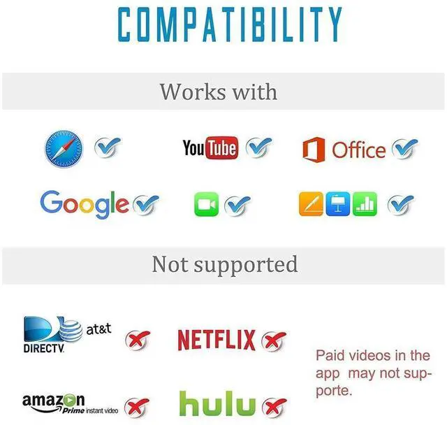 APP Support: It supports YouTube, Hulu Plus, IDMB, Quickly, Family On TV, ABC, NBC, FOX and local videos.Please Note: Not support Netflix / HBO GO / Affinity Player / Prime / Hulu / DIRECTV and other Paid Videos in App Fitment