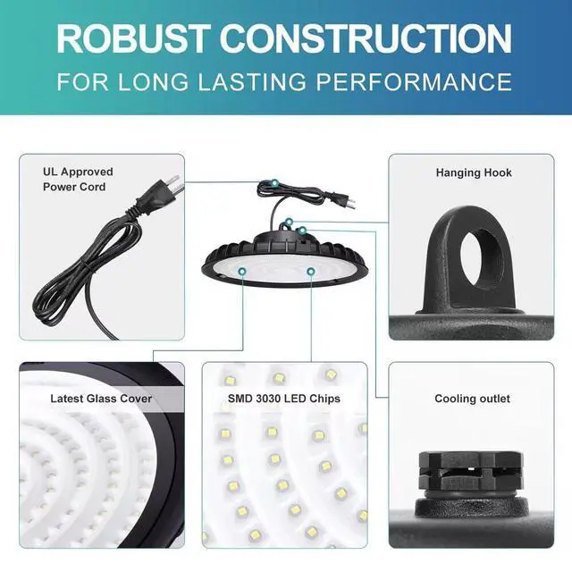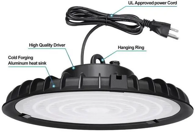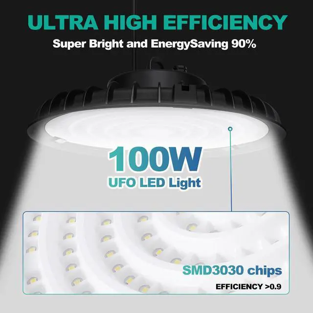 Product description Chunnuan LED Light led ufo high bay led high bay light fixtures led warehouse lights ufo light high bay led shop lights, Illuminate Your Colored Life Chunnuan LED High Bay Light Fixtures are the easy solution to indoor and outdoor area lighting needs in industrial and commercial applications The warehouse high bay fixture is a great replacement for your metal halide fixtures, and provide a cost-efficient solution Outstanding thermal solution suit for usage in commercial application Energy saving High bay LED UFO light have universal application and can save up to 80% on electricity consumption Unique Design Adopts the high quality stainless steel, double ensure heat dissipation By using a lower watt unit, energy savingIP54 ingress protection, waterproof, dust proof and explosion proof Easy and fast installation Hook & Bracket Mount Design make easier installation Widely Application Widely used in Garage, warehouse, basement, high shed factory, workshop, logistics center, exhibition hall, sports gymnasium, mine, highway toll station, supermarket Technical Characteristic Wattage100W MaterialAluminum Beam Angle120° VoltageAC 110V Lumen10000LM Dimensions209 * 67 mm Weight0783 Kg Light ColorCool White Color Temperature6000-6500K Light source96Pcs * 2835 SMDs ProtectionIP65 Application (indoor use)Plants, Playground, Workshops, etc Warm tips Our lights have warehouses in the United States, so do not worry about waiting for too long! If you order, the product can arrive in about a week