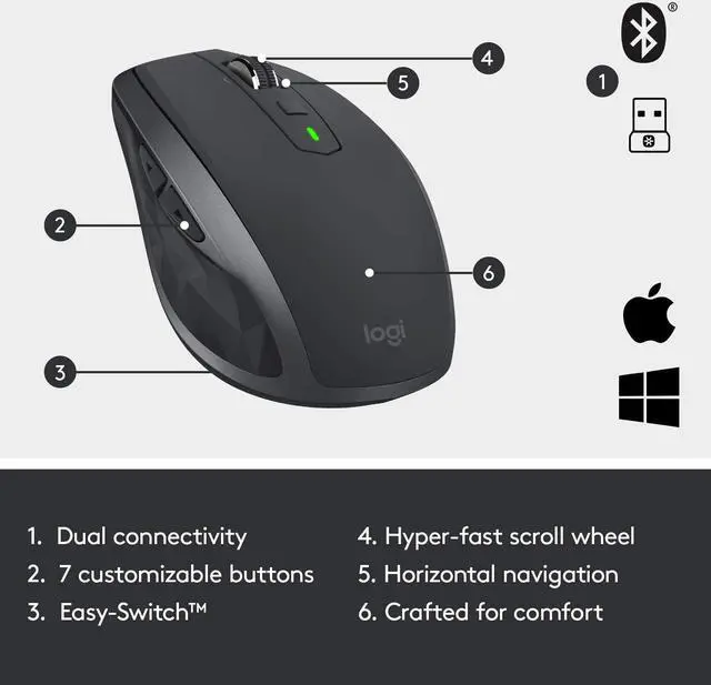 The MX anywhere 2S is the advanced mobile mouse for power users. Harness the power of Logitech Flow and take multi-computer use to a bold new level. Control up to three computers and seamlessly move text, images and files between devices. Scroll through documents and web pages faster and easier with the hyper-fast scroll wheel. Mx anywhere 2S is ready when you are. It holds a full charge for over two months and in just three minutes you get enough power for a full day of usage. Work virtually anywhere with high precision tracking --even on glass.