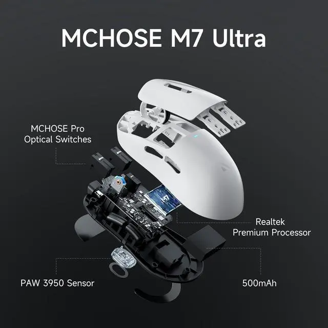 MCHOSE PRO optical switchesFeaturing specially tuned MCHOSE PRO optical switches, the M7 series minimizes double-click errors and ensures swift response times. Enjoy a crisp feel and rapid rebound, providing reliable performance during both extended training sessions and high-stakes competitions.