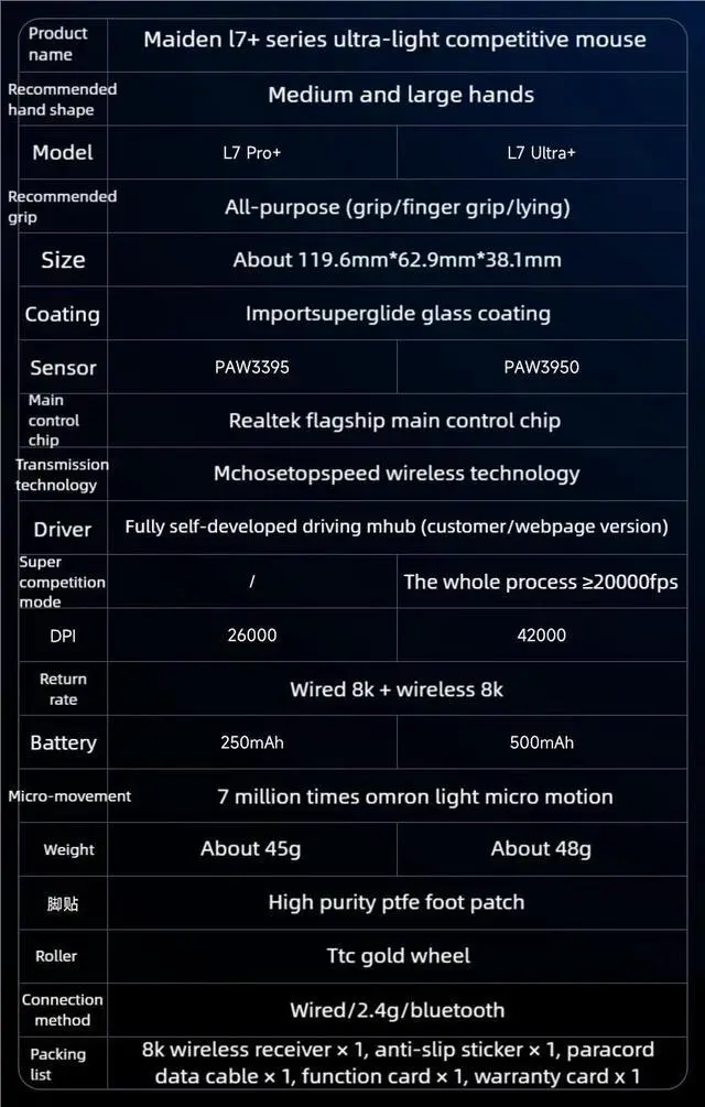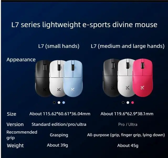 Ergonomic Comfort: Designed with a high hump and small waist angle, the L7 series mouse conforms perfectly to various hand shapes and grip styles.