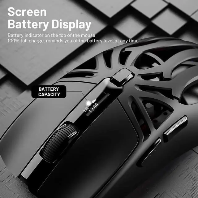 The top of the mouse is designed with a screen displaying the power level, so you can check the remaining power level at any time.