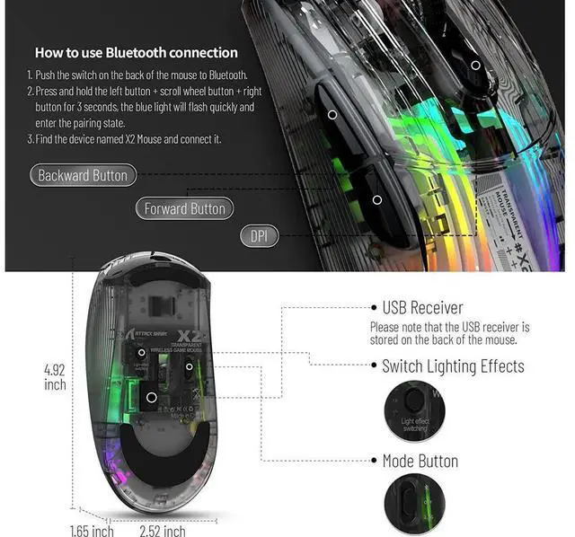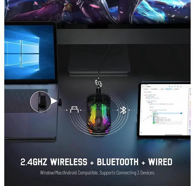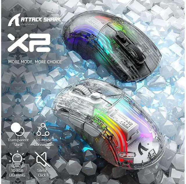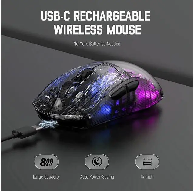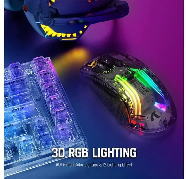 This gaming mouse, with a fully transparent shell and distinctive 3D RGB lighting, brightens your desktop. 3 connection modes, whether it is gaming or office, you can easily handle it. The high-capacity lithium polymer battery supports use while charging. PAW3212 Gaming-grade chips give you a lag-free experience.