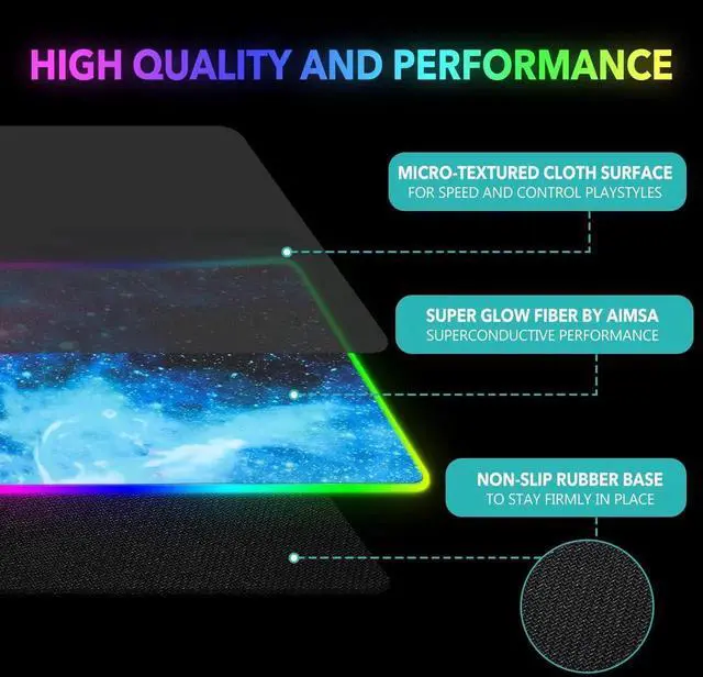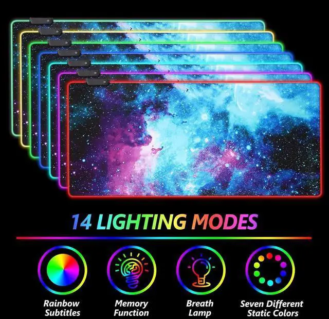 14 Lighting Modes. This Large mouse pad features 14 lighting modes: including colorful, dynamic breathing lighting mode, 7 static monochrome lighting mode and lights off mode. Providing stunning visual effects and creating an immersive game environment. Power-off memory function remembers the last lighting mode you selected