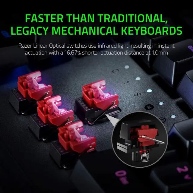 - Faster Than Traditional Mechanical Switches: Razer Linear Optical switch technology uses optical beam-based actuation, registering key presses at the speed of light (15-30% shorter actuation distance than other linear switches at 1.0 mm)