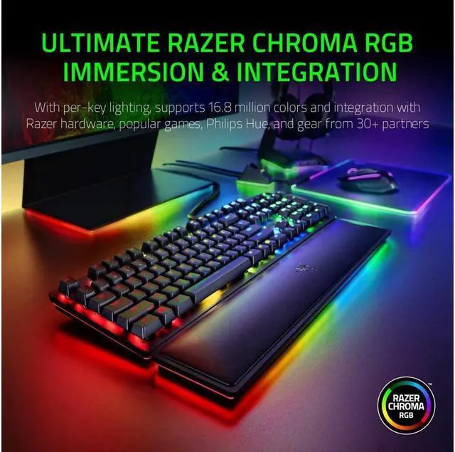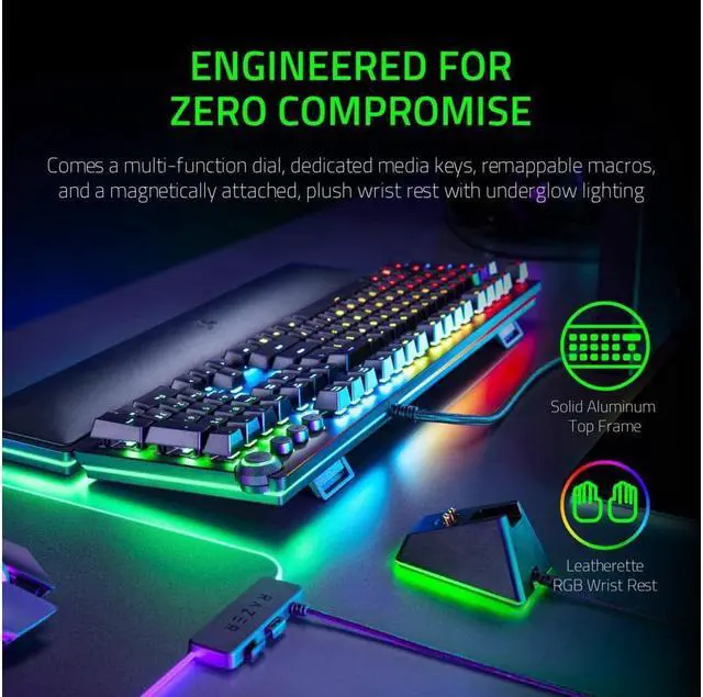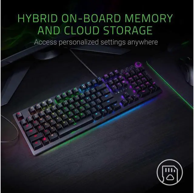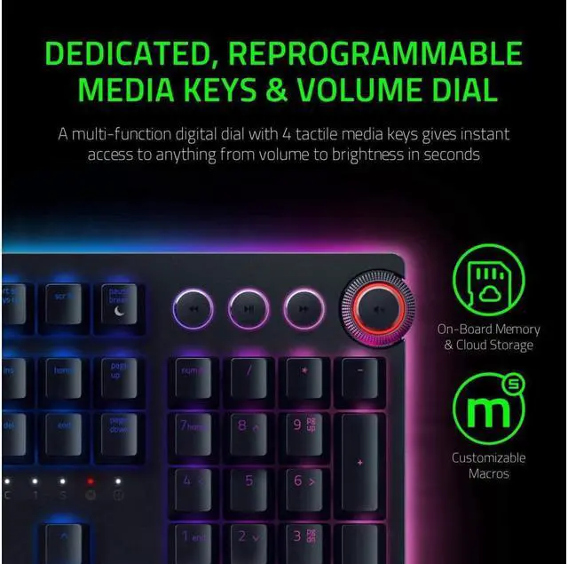 The Razer Huntsman Elite introduces the new Razer Opto-Mechanical Switch, utilizing optical technology for unmatched speed, and a key stabilizer bar so every keypress is precise and accurate. The keyboard also features a programmable digital dial for quick access to functions.