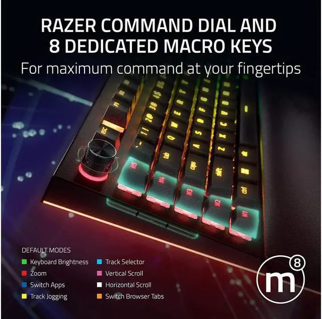 COMMAND DIAL & 8 DEDICATED MACRO KEYS Assign a custom function to the keyboards programmable dial, and game with greater command using a set of macro keys for essential keybinds