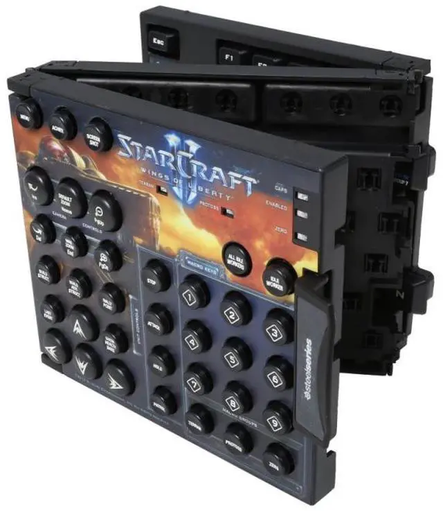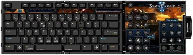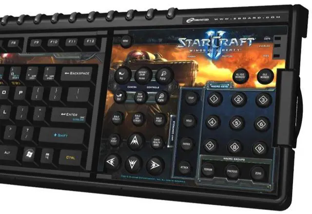 The SteelSeries Zboard Limited Edition Keyset (StarCraft II) is designed for Blizzard Entertainment's release of StarCraft II Wings of Liberty. The customized keyset mounts to the SteelSeries Zboard base and features labeled commands, in-game shortcuts and artwork from the game. The dedicated Gaming Terrain offers 3 layers of 9 customizable one-touch macro keys for frequent commands. These features are designed to help immerse players in the game, accelerate game mastery, and help increase a players actions per minute (APM).