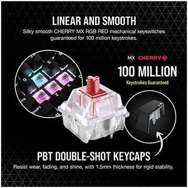 100% CHERRY MX RGB Red Mechanical Keyswitches: Offer a linear travel, combined with minimal spring force, resulting in a silky smooth keypress for performance gaming.