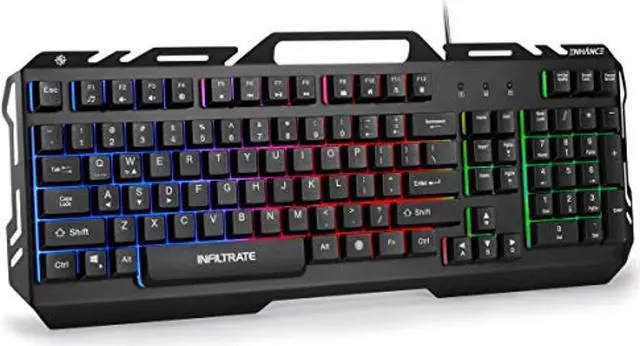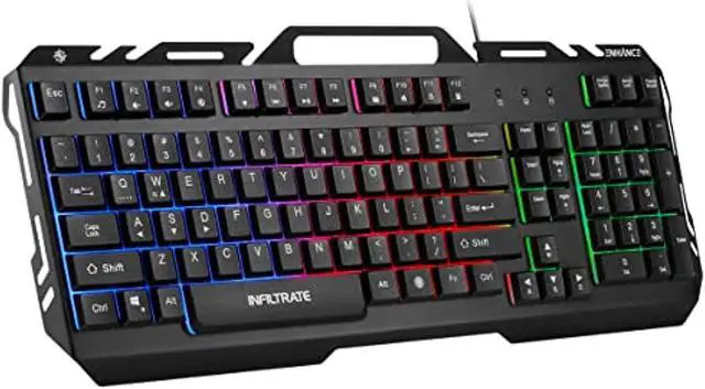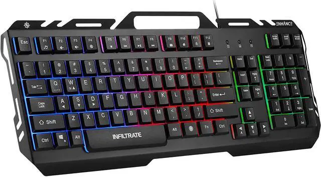 enhance infiltrate kl2 membrane gaming keyboard - quiet keyboard with 3 multi color led lighting modes, turbo input mode, anti-ghosting, 19 key roll over, slim low profile metal designThe ENHANCE Infiltrate KL2 Membrane Gaming Keyboard offers high performance PC gaming features to gamers of all skill levels. A premium design made from brushed aluminum metal sits nicely on modern gaming desks and comes equipped with a variety of LED lighting modes. Easily switch from 3 different rgb lighting modes or enable the dynamic breathing with one dedicated key. Engage a turbo input mode that significantly increases the speed of key inputs from 21 characters per second to 62 characters per second.