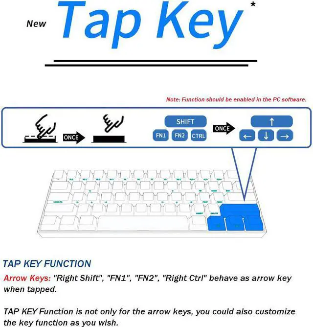 Tap Fucntion: "Right Shift", "FN1", "FN2", "Right Ctrl" are in combination as TAP key, you could set the tap layer function, and when you click the TAP key, it will triggle this layer function. By default, they behave as arrow key when tapped.
