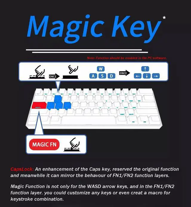 Lock function, the magic key can copy the FN1 or FN2 key function that gives you quick access to media. This means magic fn can act as the FN key. You could set the fucntion layers for FN1/FN2, customize any keys or even creat a macro for keystroke combination through the Obinslab Starter, and the Magic Fn function can mirror this Fn behavior.