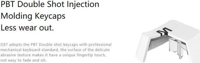 D87 adopts the PBT Double shot keycaps with professional mechanical keyboard standard, the surface of the delicate abrasive texture makes it have a unique fingertip touch, not easy to fade and oil.