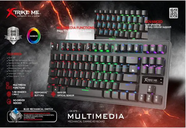 The Xtrike me keyboard with USB wires GK-979 is a mechanical keyboard, 50 million clicks with rainbow backlight (mixed color). With its design and optimization, this keyboard is perfect for long use. Hanging button design for easy maintenance and an elegant look. Compatible with Windows 7 or newer, plug and play USB 2.0 interface