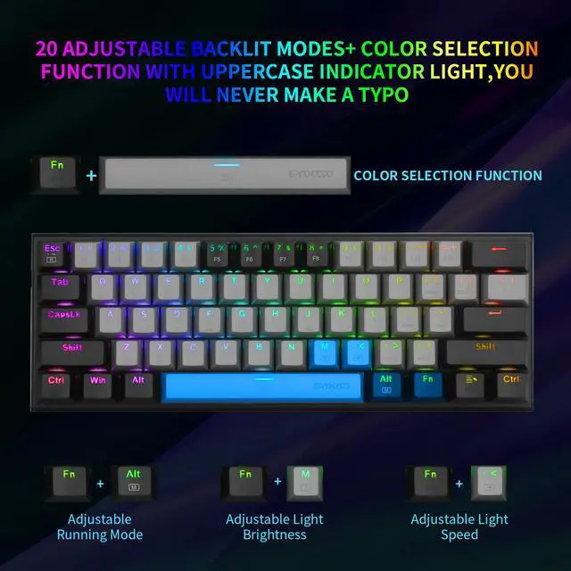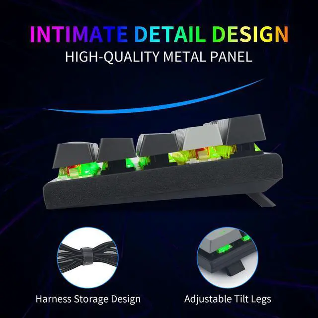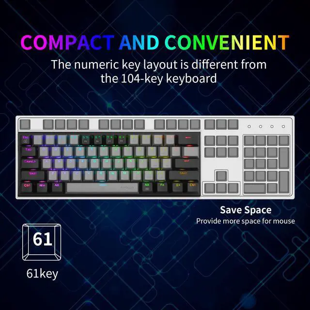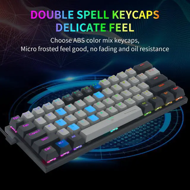 Easy Installation Just plug and play, USB interface, No need driver and software. The including keycap puller is for easy cleaning and maintaining Double Injection Keycap And Adjustable Tilt Legs The keyboard comes with extra. Double The injection-molded Keycaps provide crystal clear uniform backlight and ergonomic curves, ensures lettering that doesn't scratch off. The bottom of the keyboard is designed with a foldable bracket, choose the height you need Compact&Ergonomic Design With 61 keys, it is smaller to save space on your desk and more portable. The stepped keycap makes it sleek to fit your hands easily to prevent fatigue.