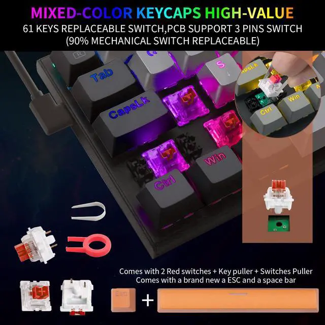 Provides Windows Key lock for gaming Custom Mechanical Switches Red switches which offer silent click and precise tactile feedback for typing and gaming control each key independently. And you can replace the switches by yourself if need Windows Locking Provides Windows Key locking with FN+Win Key in order to avoid buttom Win key by accident when you gaming Package Content 1 mechanical keyboard 1 user guide 1 keycap puller 2 beautiful orange or white keycaps (ESC and space bar)