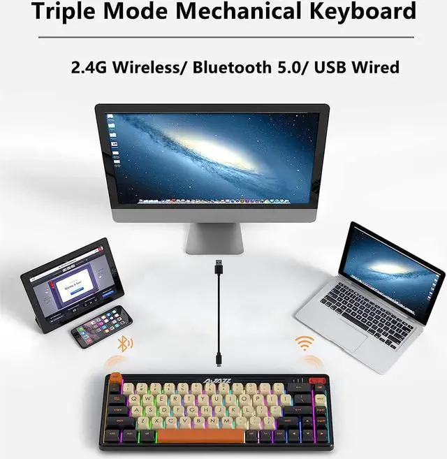 TRIPLE MODE MECHANICAL KEYBOARDWireless modes with stable Bluetooth 5.0 chipset, hassle-free 2.4G hz dongle plus USB wired mode ensure no limits low latency and stable connection. The K690T is best for smartphone, laptop, and tablet.