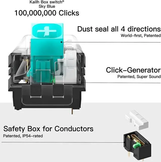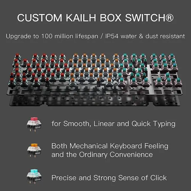 Using PBT dual color injection molding process, with high wear resistance and oil resistance. High-value pudding-style keycap design gives you a more visually layered feel. Keyboard with unique precision Kailh Box switches, dust and moisture resistant, withstand 100 million keystrokes.