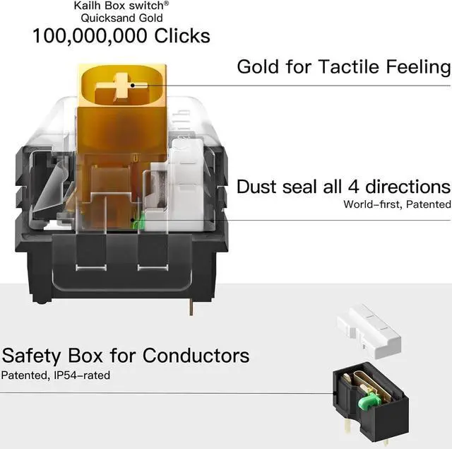• The Box gold switch offers a smooth, linear and quick typing response. The Box Blue switch sounds clear and clicky due to a sound generator inside which is very popular among gamers.