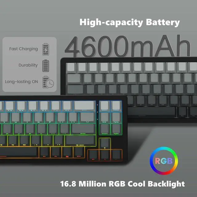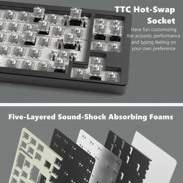 This 75% percent keyboard keyboard features a gasket structure with pre-lubed linear switch. It incorporates a transparent PC mounting plate, internal gasket design, and a bottom-mounted flexible cotton pad, etc, a total of 5 layers of luxurious filling. Ensuring a tight fit between internal components. This design effectively reduces noise, resulting in a pure and comfortable typing experience with enhanced tactile feedback and sound quality.
