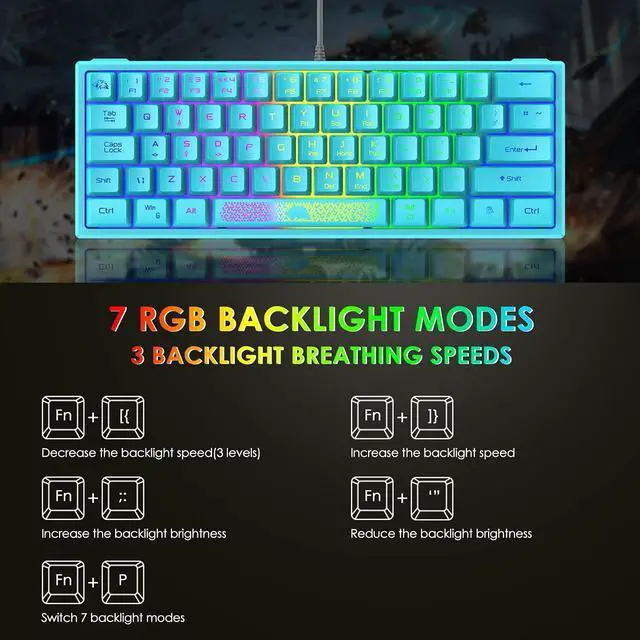 - 7 Kinds of Backlht Adjustment: Press FN+P key to adjust backlight mode(Up to 7 Kinds), Press FN+[{/]} key to adjust backlight color when in monochromatic backlight mode(Up to 8 Kinds), Press FN+ ‘” /;: key to increase/decrease backlight brightness, When in flowing backlight mode, Press [{/]} to slow down/speed up the backlight speed.