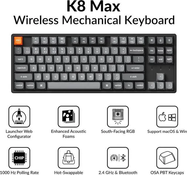 The K8 Max is a configurable wireless mechanical keyboard with a TKL (80%) layout. Upgraded to a 2.4 GHz wireless connection that features a 1000 Hz polling rate (on both 2.4G and wired modes). Configurable through Keychron Launcher web app and enhanced thock feel designed for peak productivity!
