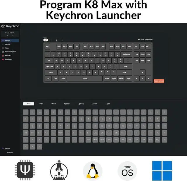 Remap Any Key on Web Browser - Simply connect the K8 Max to your device with a cable, open the Keychron Launcher web app, drag and drop your favorite keys or macro commands to remap any key on any system (macOS, Windows, or Linux) for a fluid workflow. Or create your keymap with open-sourced QMK firmware.