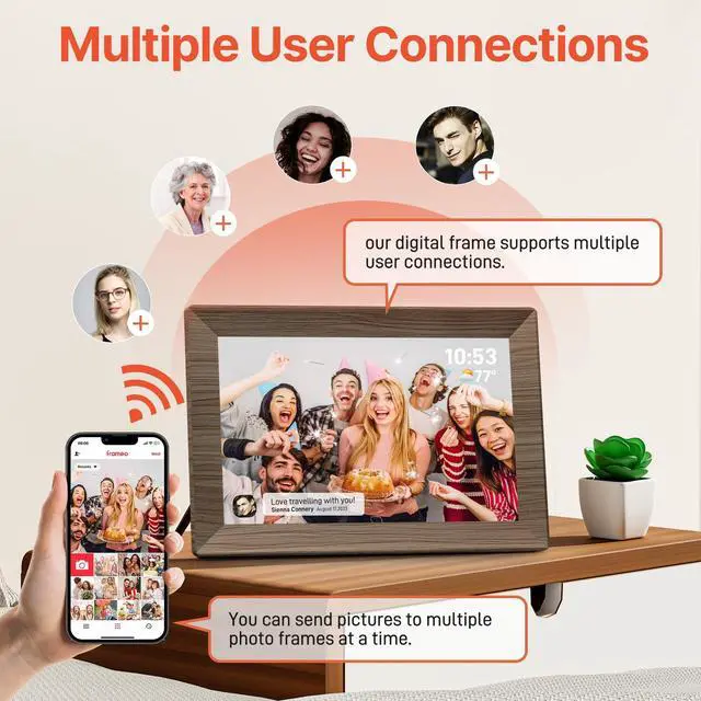 • [Share Photos and Videos Instantly Via "Frameo" APP]Share every wonderful moment with your family and friends. Connect the digital picture frame to a WiFi network and share photos and videos anytime and anywhere Via "Frameo" APP. Photos and videos can be presented within a few seconds, add titles to photos to show your mood and experience fully! Download the "frameo" app for iOS and Android for fr-ee to give you full control of the digital photo frame