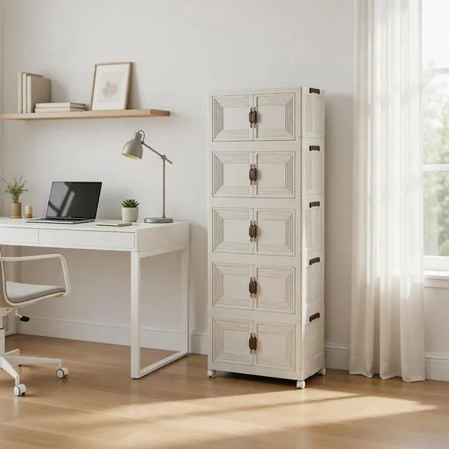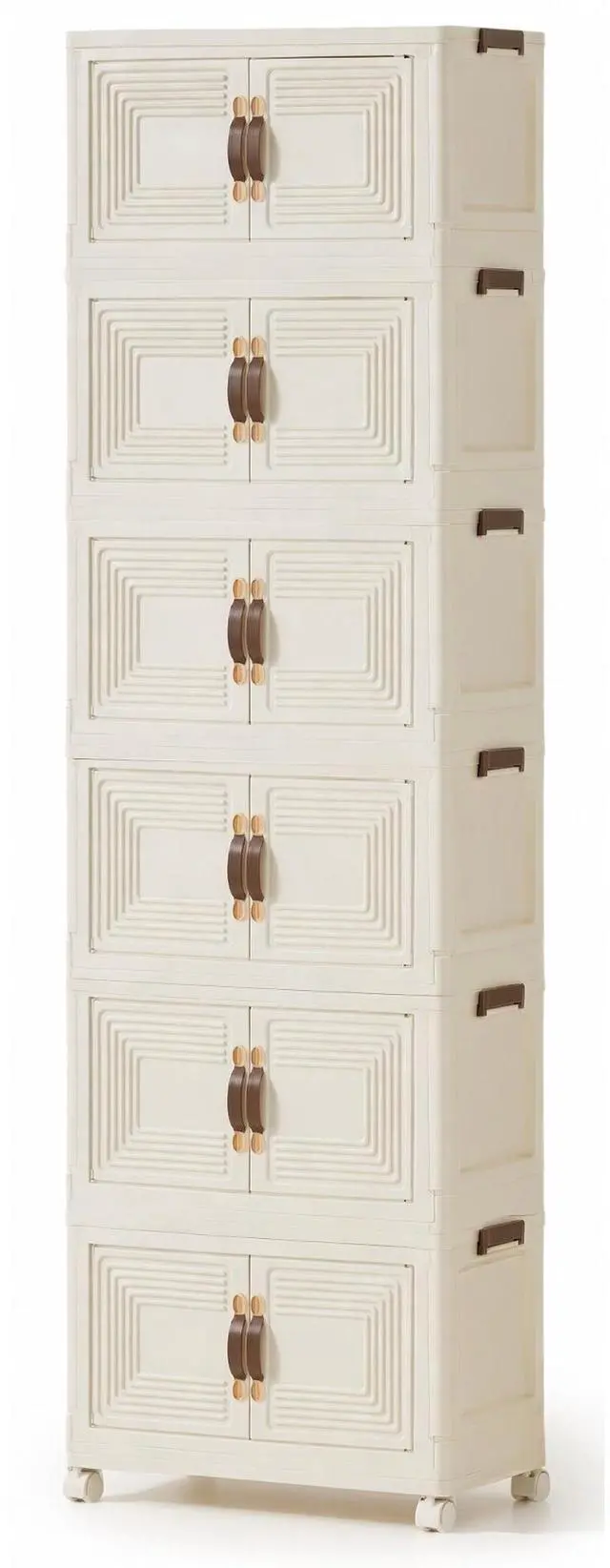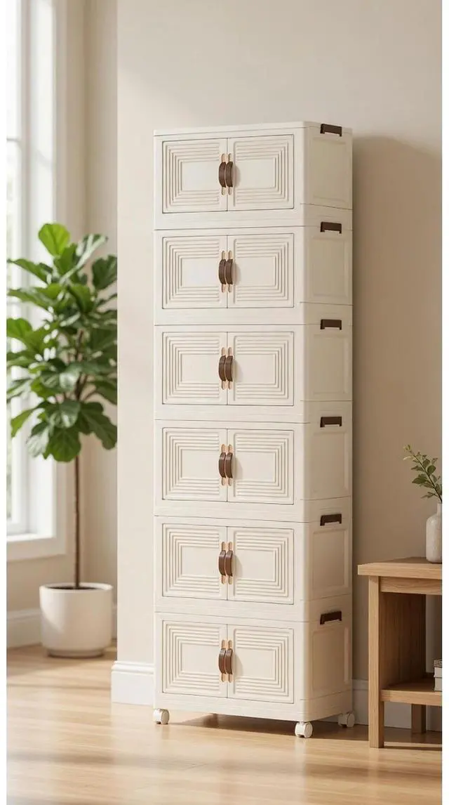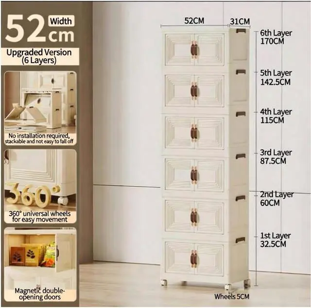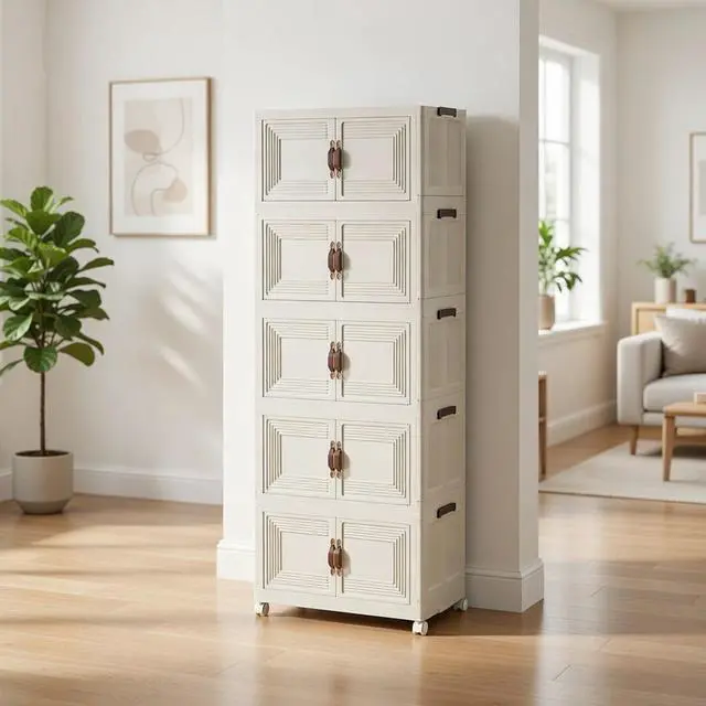 Each tier features magnetic double doors to protect items from dust and keep your space tidy, while 360° caster wheels let you move the cabinet effortlessly. Made from durable, easy-clean plastic, this sleek, modern cabinet is perfect for bedrooms, offices, kitchens, closets, dorms, and apartments. Store clothes, toys, books, pantry items, and more with ease.