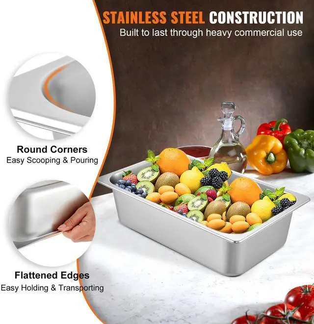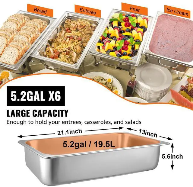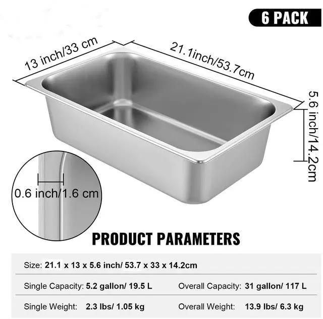 Material: Stainless Steel Capacity: 31 Gallon/ 117 L Quantity: 6 Packs Food Pan Thickness: 22 Gauge/ 0.03 inch Overall Size: 21.1 x 13 x 5.6 inch/ 53.7 x 33 x 14.2 cm