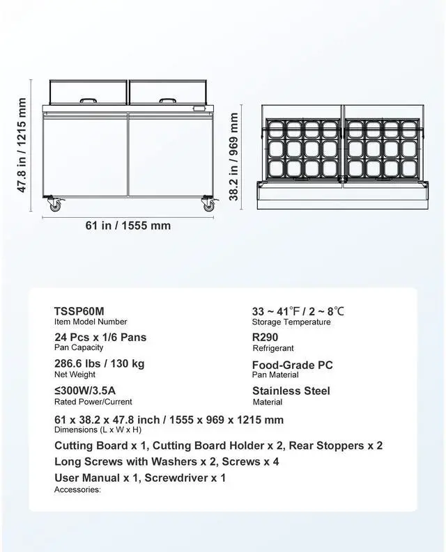 Dimensions (L x W x H): 61 x 38.2 x 47.8 inch/1555 x 969 x 1215 mm (with cutting board installed)