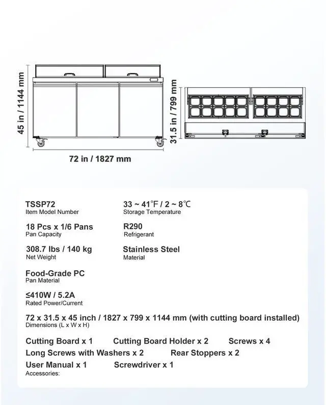 Dimensions (L x W x H): 72 x 31.5 x 45 inch/1827 x 799 x 1144 mm (with cutting board installed)