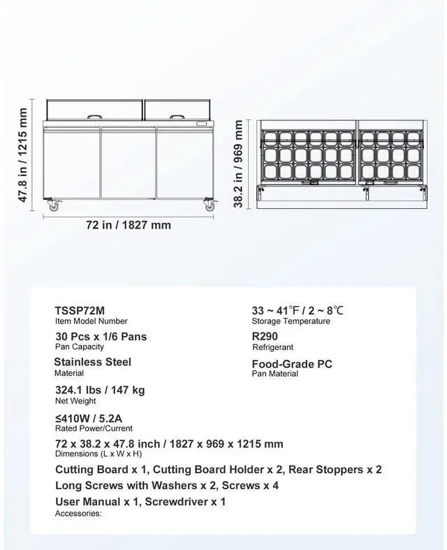 Dimensions (L x W x H): 72 x 38.2 x 47.8 inch/1827 x 969 x 1215 mm (with cutting board installed)