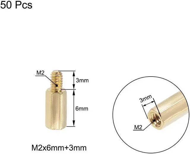 Brass(H59-1) Size: M2 x 6 mm + 3 mmFeatures1. These standoffs are made of brass which strong, anticorrosive, compact and portable, durable material for a long time use2. Accord with standardized metric system. And the average error is less than 0.01 mm. The screw thread is quite sharp, clean and accurate. The accurate size makes your installment or repair easierPackage IncludedM2 Brass male-female standoff 6 mm + 3 mm, 50 pieces