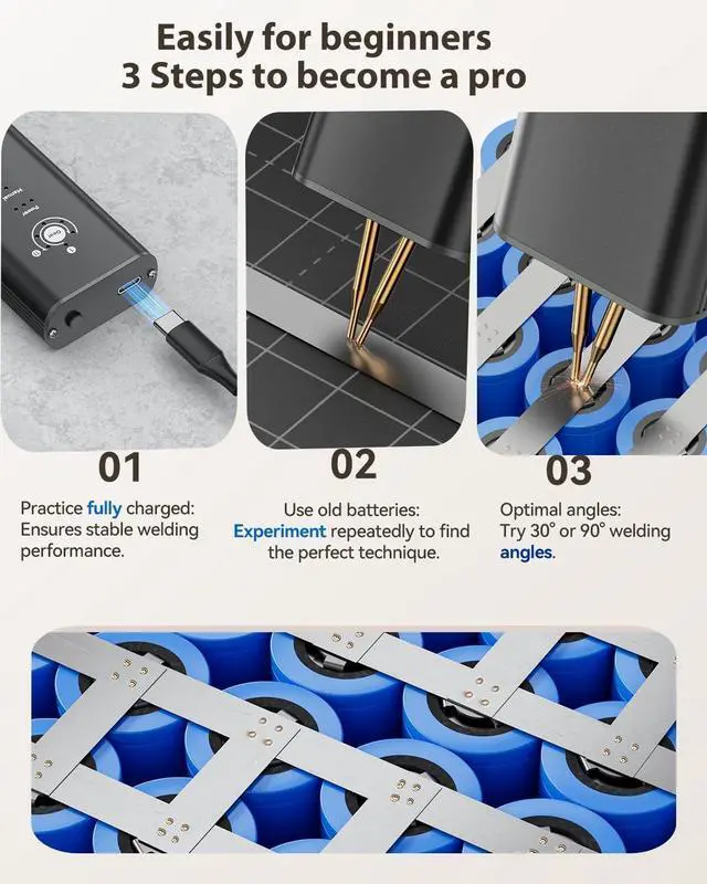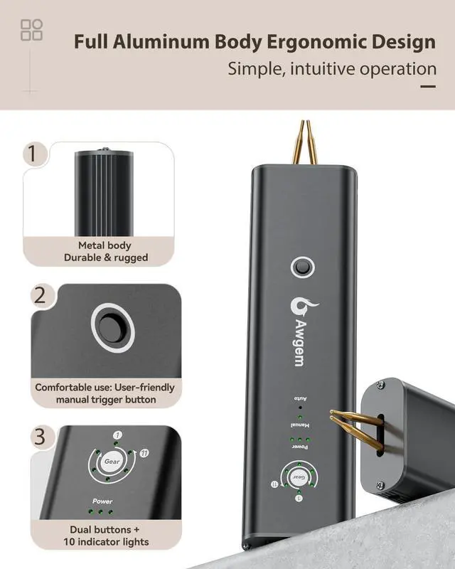 Integrated Design: Awgem battery spot welder power supply and welding pen are combined into one, you can weld easily without an external welding pen. The mini welder is designed for one-handed operation. freeing your other hand to hold the nickel strip, making welding a breeze