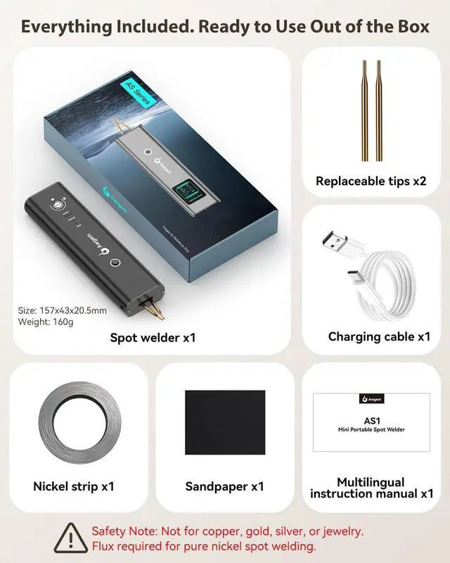 Package List: Awgem Battery Spot Welder include (1)1*Host (2) 2*Copper needle (3) 1*2m nickel roll (4)1*Frosted paper (5)1*Type-Ccharging line