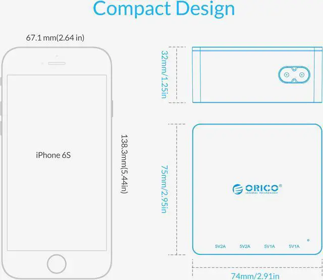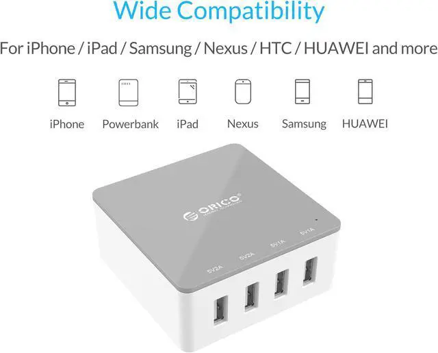 ORICO 30W 4 Ports USB Super Charger works with most USB devices including smartphones, tablets, notebooks and more popular compatible devices are: iPhone 6/6 Plus, iPhone 5/5s/5c/4/4s, iPad/Mini, iPod, LG G3, Samsung Galaxy, Amazon Fire Phone, HTC One, Nexus and etc.
