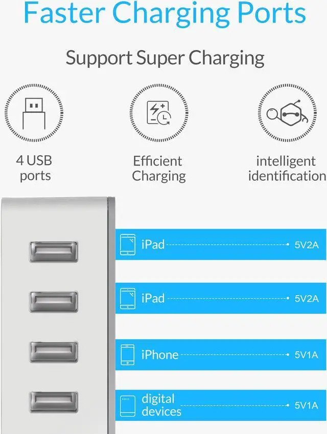Super charger with intelligent power-supply technology makes your devices to deliver its fastest possible charging speed of up to 2 amps per port