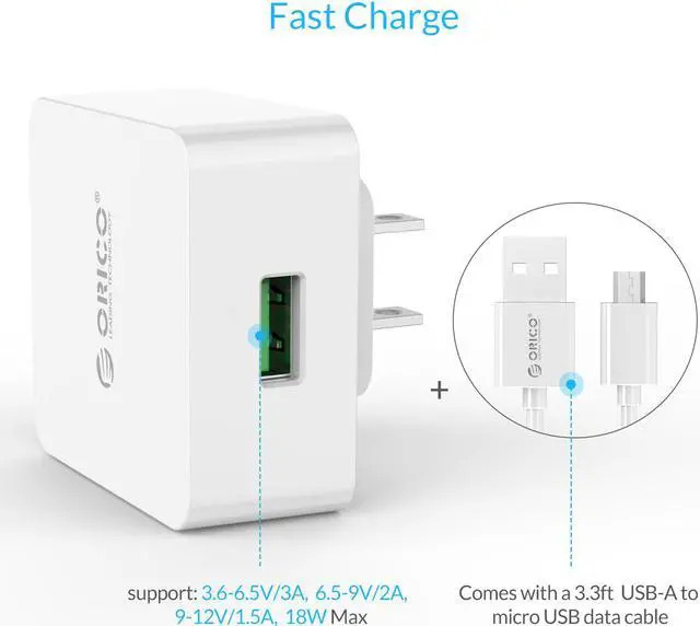 What is in the box: 1 x ORICO QC3.0 USB Charger, 1 x 3.3ft. Android Data Cable, 1 x User Manual, 1 x Service Card; we provide 18-Month warranty and lifetime technical support for purchase via ORICO direct store