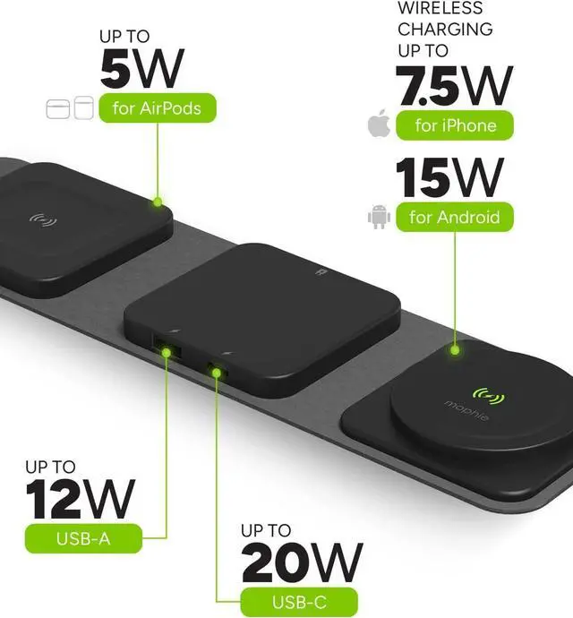 • Versatile Power Output: Delivers up to 7.5W for iOS and 15W for Android devices, with dedicated 5W AirPods charging spot