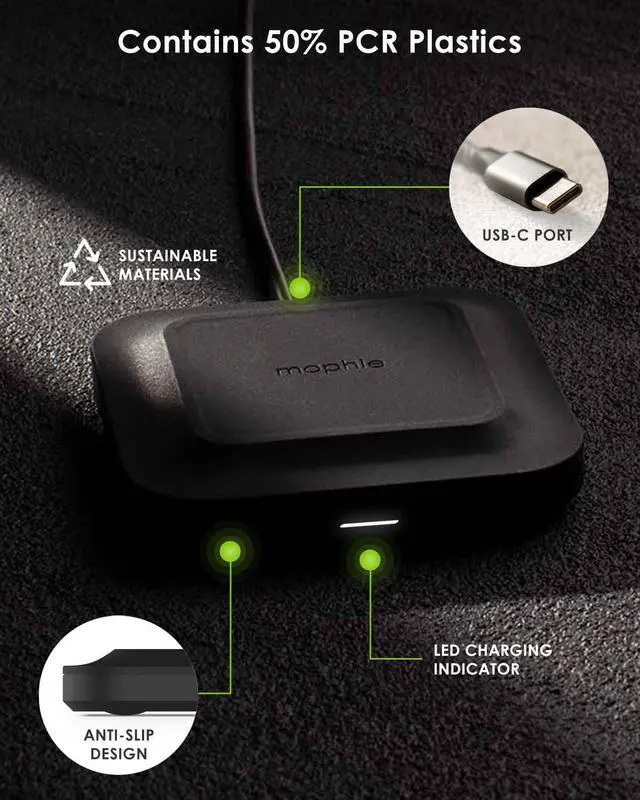 Elevate your charging experience with the Mophie Universal Wireless Charge Pad. Designed to seamlessly integrate into your daily life, this pad offers a convenient solution for keeping your Qi-enabled smartphones, like iPhone, Google Pixel, and Samsung Galaxy, always charged. With up to 15W of fast-charging power, it delivers the quickest charge your device can accept, ensuring you're ready for the day ahead. The Mophie charge pad's universal compatibility means you can power up a wide range of devices without a hitch. What's more, it's engineered to charge through cases up to 3mm thick, sparing you the inconvenience of removing your phone case. The inclusion of a Mophie power adapter ensures you're all set to start charging right away. Crafted with a keen eye for detail, the charge pad boasts a stylish premium fabric finish, adding a touch of elegance to your desktop or nightstand. The anti-slip rubber ring further enhances its practicality by keeping your device securely in place during charging. Whether it's for a quick power boost or a full charge while you work or relax, the Mophie wireless charge pad is an essential addition to your tech ensemble, simplifying your charging routine in style.