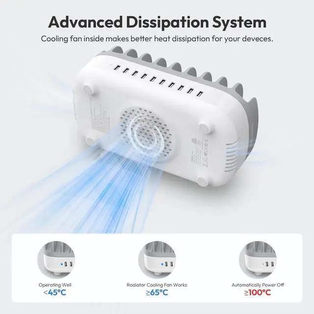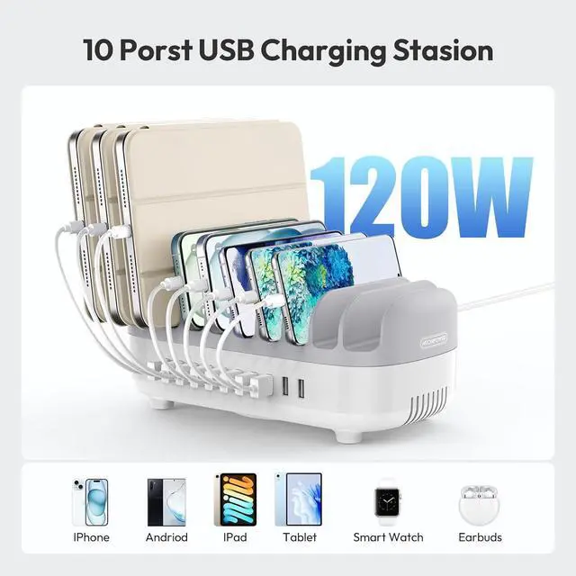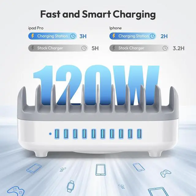 Powerful 120W USB Charging Station - Not like other charging stations with short, unstable and fragile plastic/wood separators, the fast charging station for 10 electronic devices that charges at full speed simultaneously, the built-in smart chip automatically recognizes, adjusts and distributes the optimal output, each device can get the maximum charging speed (every 5V/2.4A, total 120W)